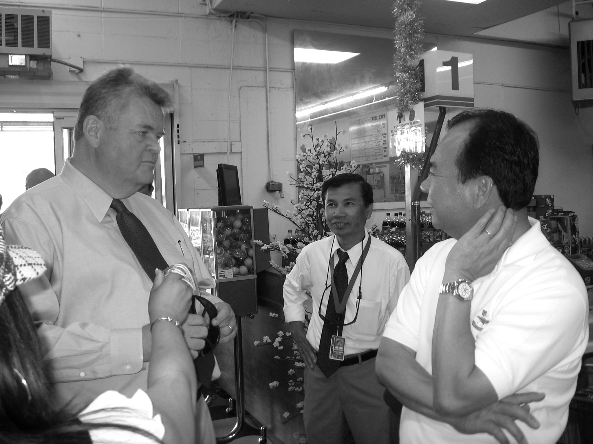 Mayor Greg Nickels, left, meets with Viet Wah grocery store owner Duc Tran, right. International Examiner Photo, August 8 & September 2, 2008
